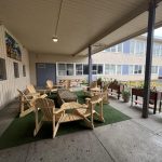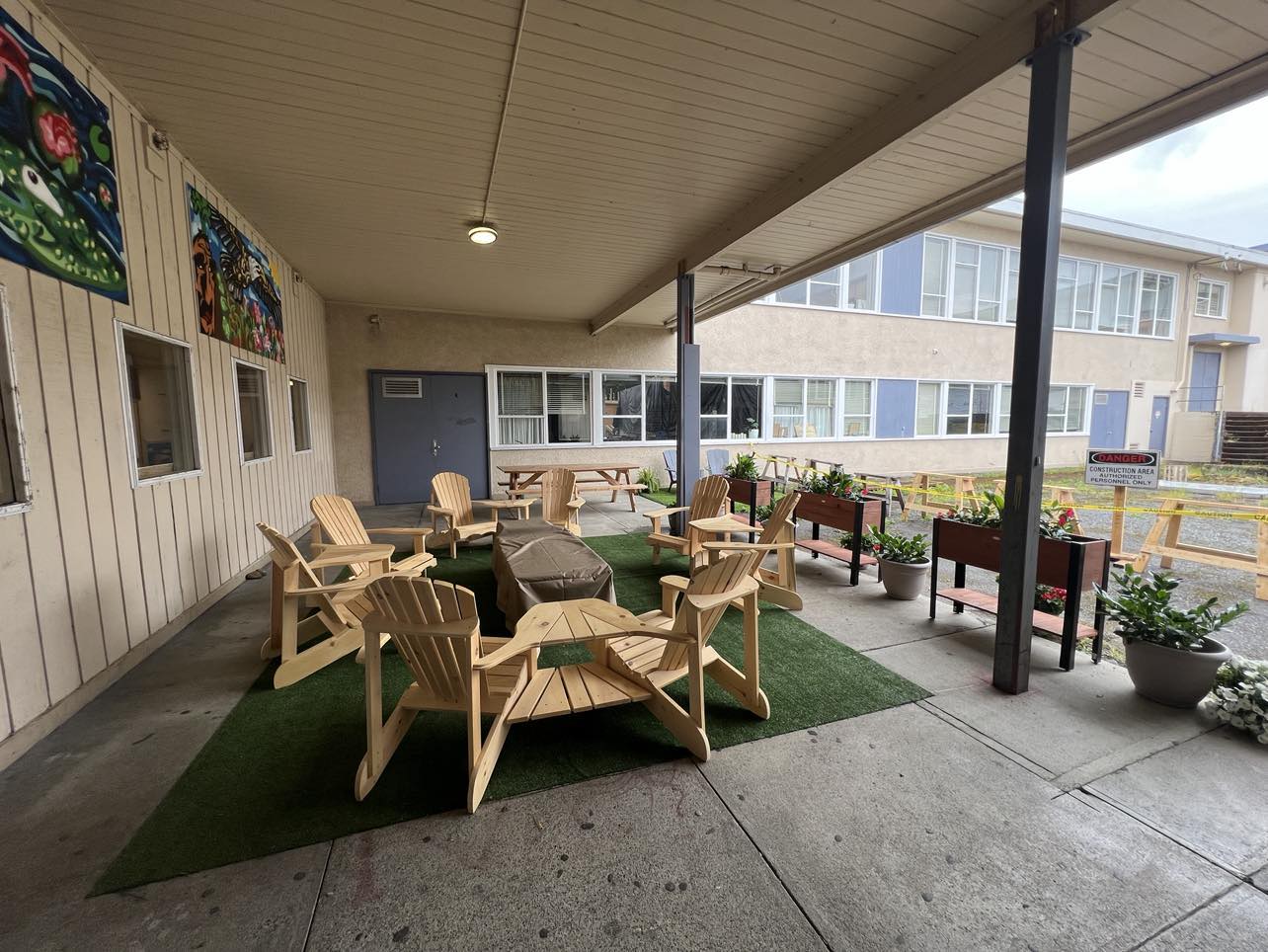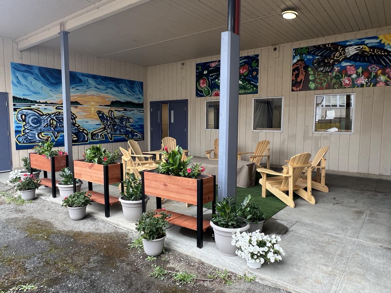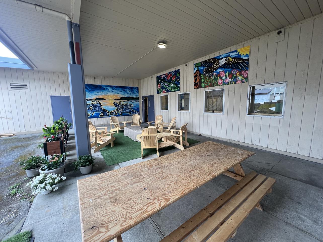 Photo Descriptions: These photos showcase the final product of our brand-new outdoor classroom. This beautiful and welcoming space was co-created by students and teachers working side by side. Together, they envisioned, planned, and built an environment that fosters connection, learning, and well-being. The space features comfortable Adirondack chairs arranged in a circle, centred around a covered fire table where classes can gather for warmth and conversation. Vibrant planter boxes and potted flowers line the area, bringing life, colour, and a sense of calm. The stunning murals add to the atmosphere, reflecting the land, culture, and creativity of our community. Because this area is fully covered, it can be used for learning, meetings, and gatherings for ten months of the year, rain or shine. It is a testament to what can be accomplished when we come together with a shared vision – creating spaces that support belonging, inspiration, and growth. Click on image to enlarge.