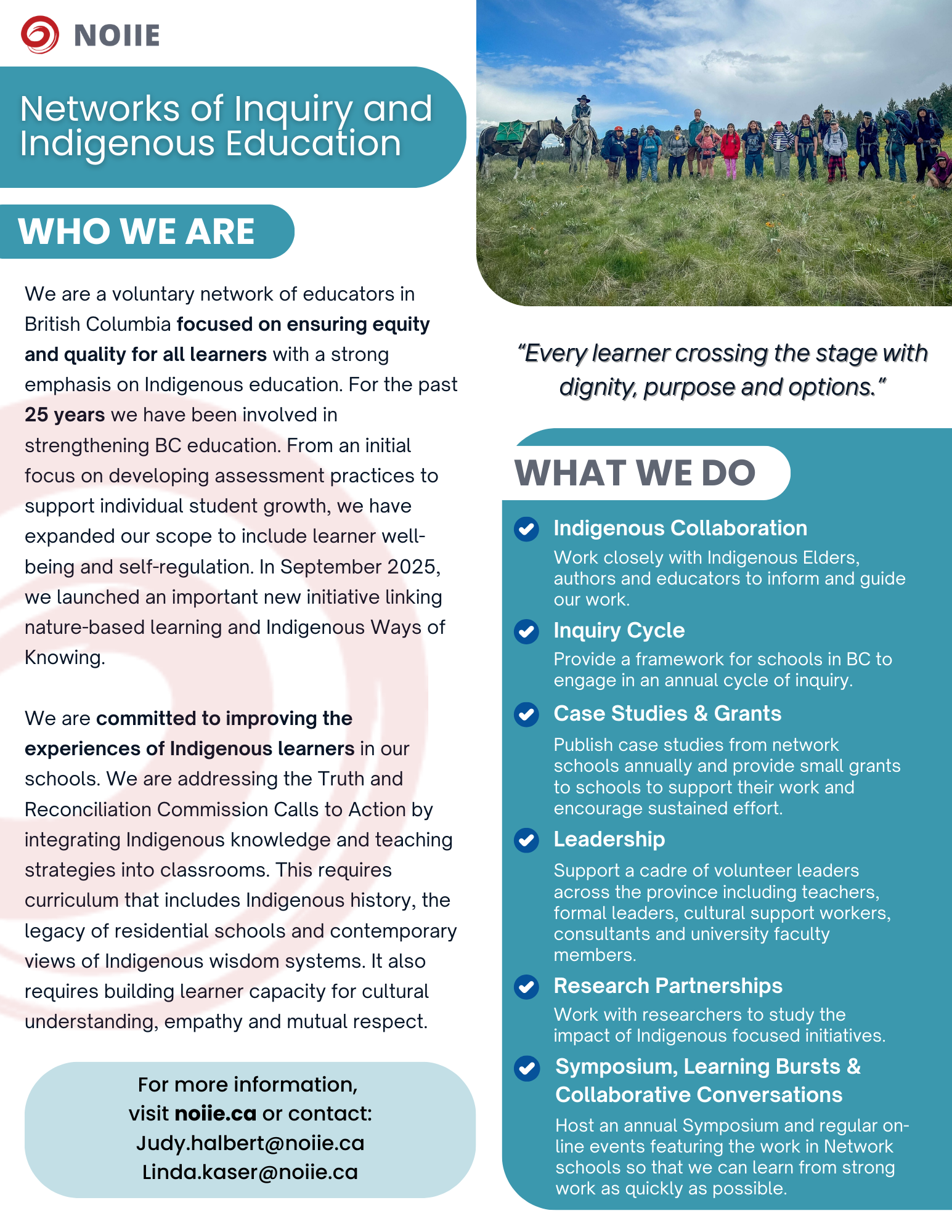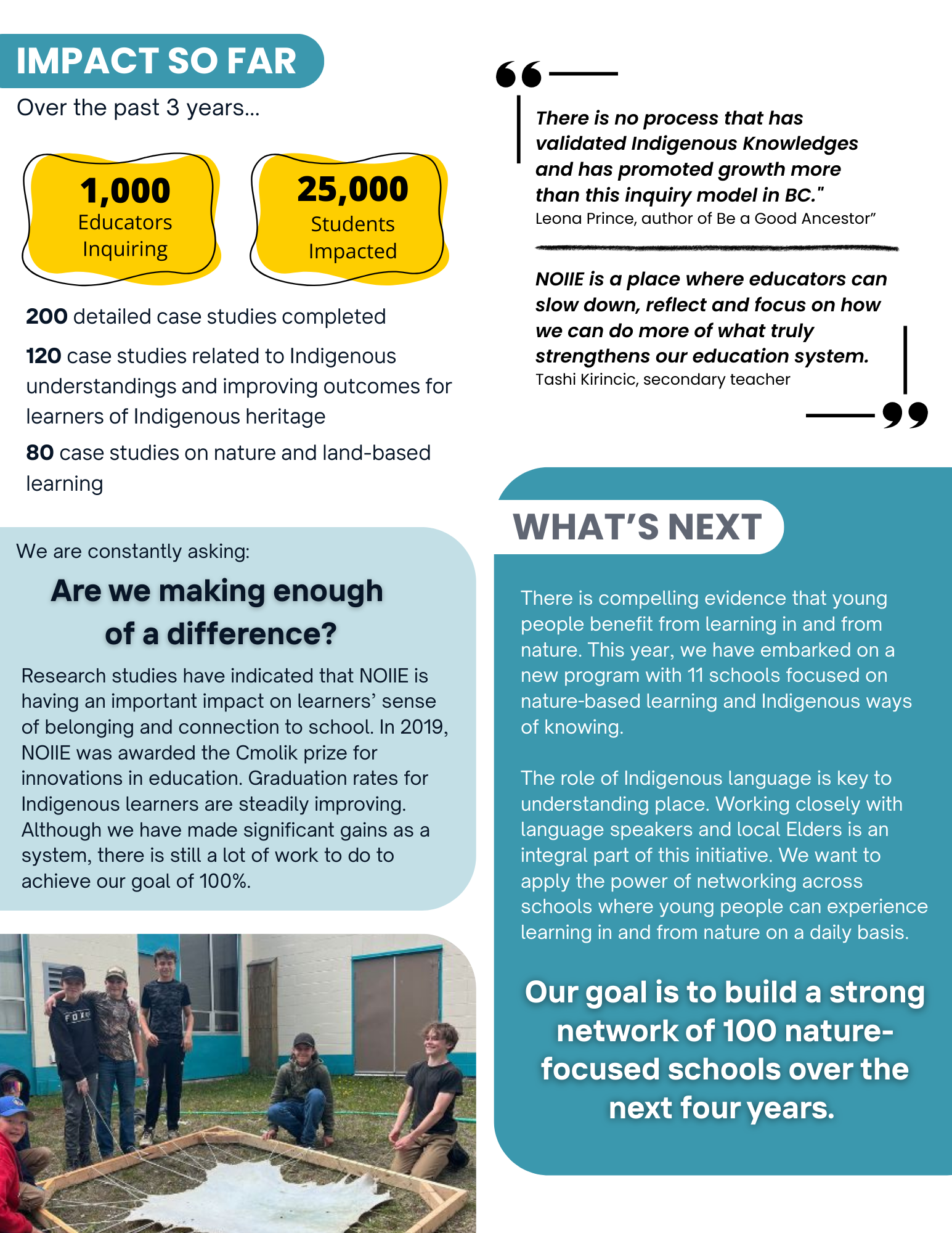 The NOIIE Indigenous Transitions Study explored how collaborative inquiry can help educators to improve transitions for Indigenous students—from grade to grade, school to school, and beyond school. Dr. Catherine McGregor & Jo Chrona, with assistance from Dr. Allyson Fleming & Rochelle Esterhuizin, have published a 2024 NOIIE Transitions Report that draws on written case studies and extensive interviews with team members from the 20 participating schools, the learning coaches and the network leaders.